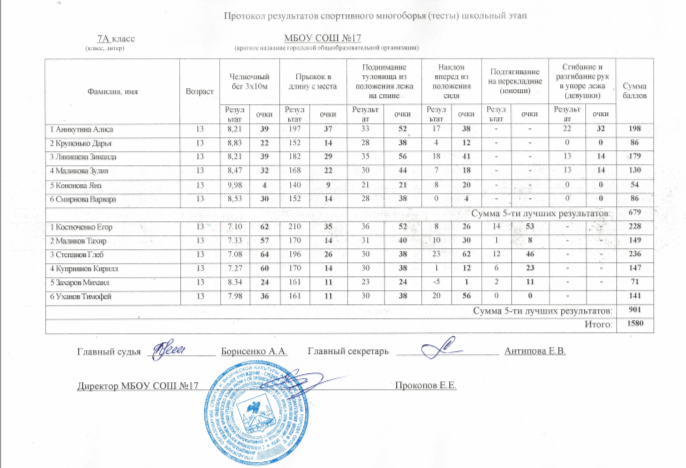 Протокол результатов спортивного многоборья (тесты) школьный этап