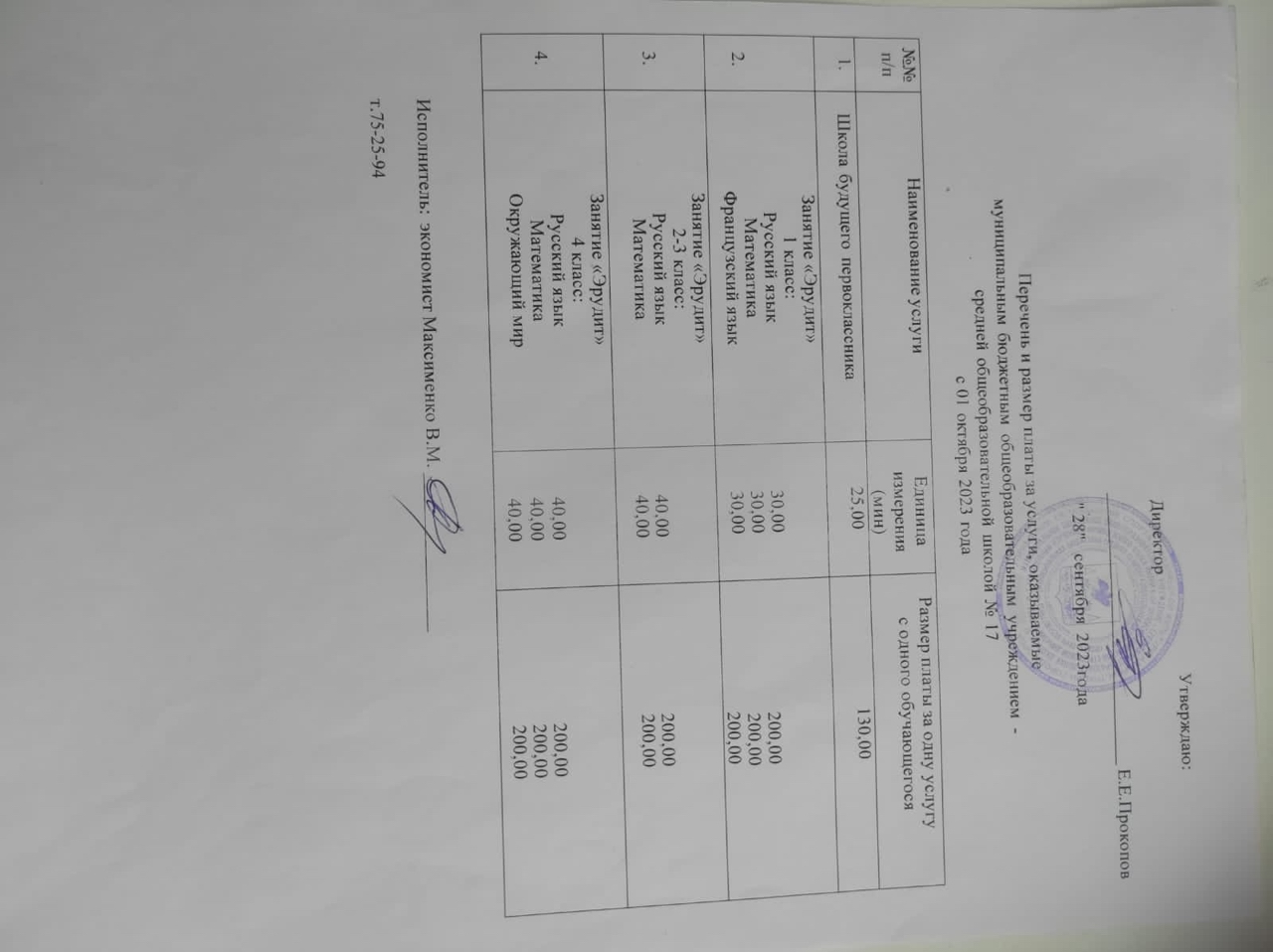 Перечень и размер платы за услуги, оказываемые МБОУ СОШ № 17 г. Орла