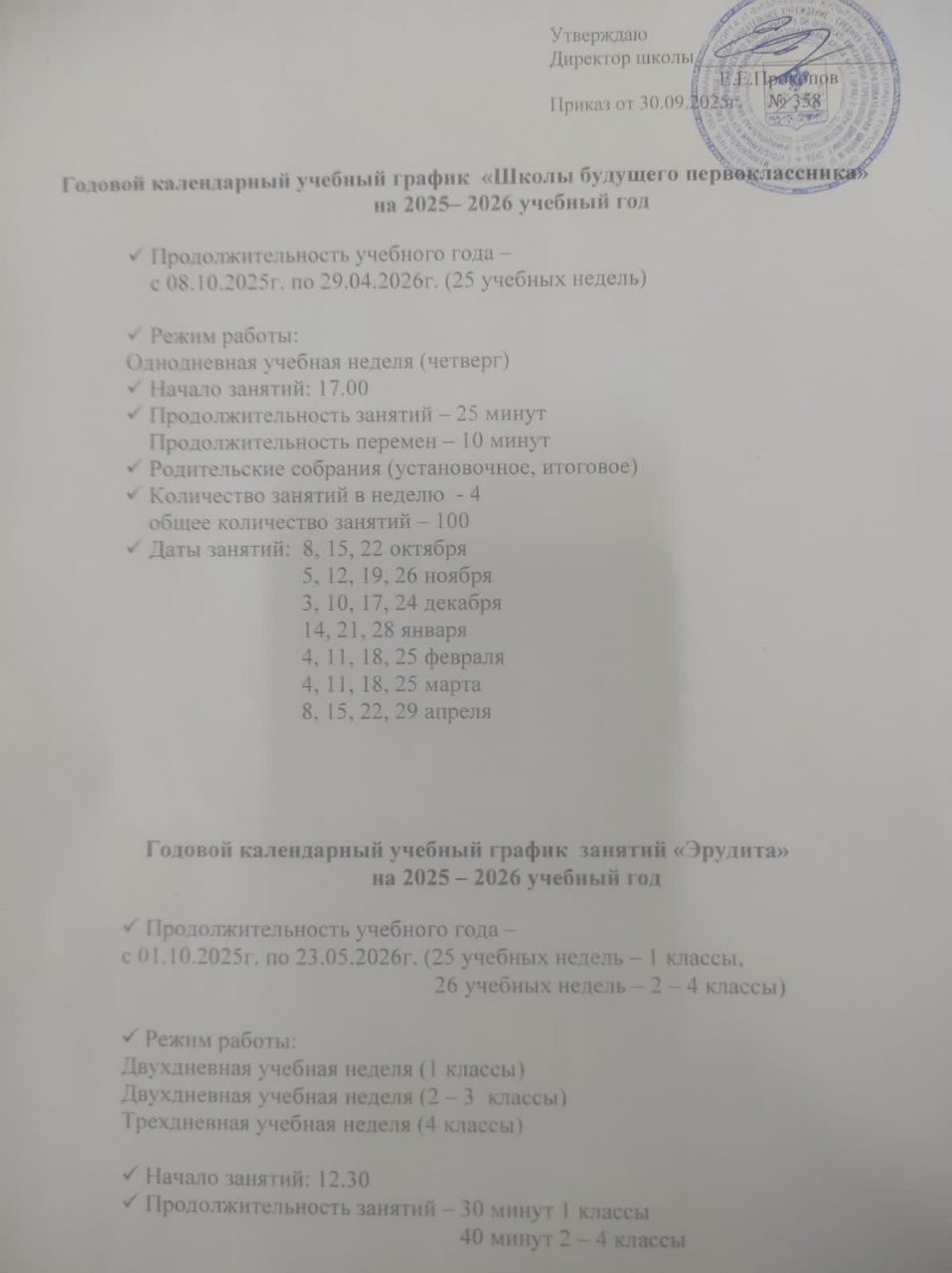 Годовой календарный график "Школы будущего первоклассника" и "Эрудита" на 2025-2026 учебный год