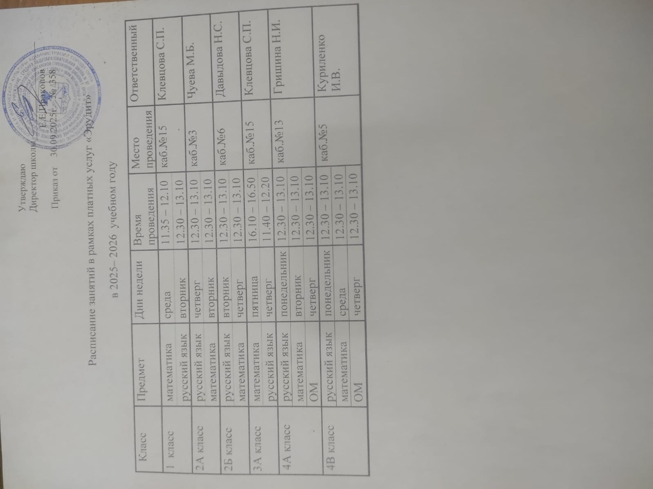 Расписание занятий в рамках платных услуг "Эрудит" на 2025-2026 учебный год