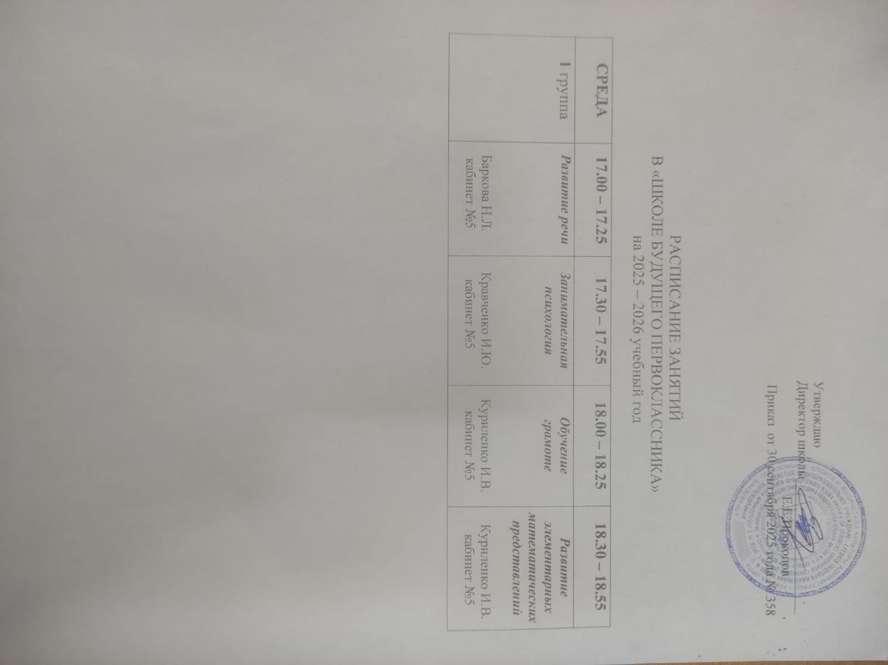 Расписание занятий в "Школе будущего первоклассника" на 2025-2026 учебный год