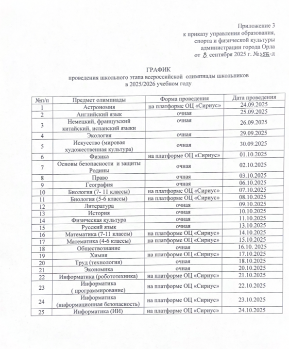 - График проведения школьного этапа Всероссийской олимпиады школьников ( Приложение №1 к приказу от 22.09.2025 № 351)